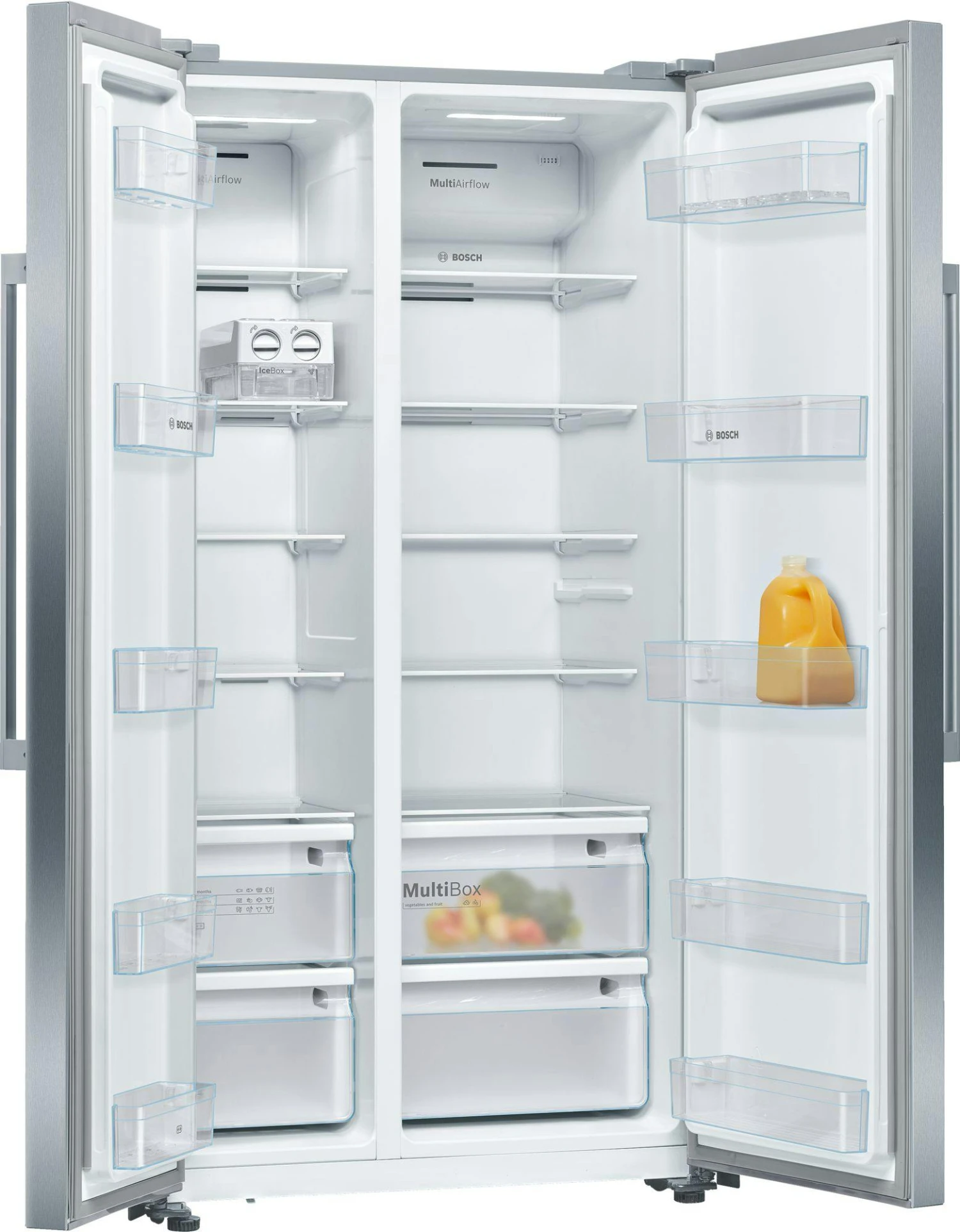 Vertikaler Stangengriff, NoFrost, außen Digitalanzeige, getrennte Temperaturregelung für Kühl- und Gefrierraum, SuperKühlen, Super-Gefrieren, optischer und akustischer Türalarm, herausnehmbarer Ice-Twister, Kühlteil: Multi Airflow-System für optimale und gleichmäßige Kälteverteilung, 5 Abstellflächen aus Sicherheitsglas, 3 durchgehende Türabsteller, 2 MultiBoxen auf Rollen – transparente Schubladen mit Wellenboden, ideal zur Lagerung von Obst und Gemüse, Gefrierteil: 2 transparente Gefriergut-Schubladen, 5 Türabsteller im Gefrierraum, Gerät auf 4 Rollen, justierbar, Zubehör: 1x Eierablage