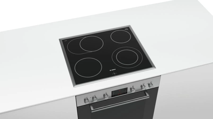 Bosch Serie 4 HND411LS65. Kochfeldtyp: Keramik, Anzahl Herdplatten/Kochzonen: 4 Zone(n), Art der Oberfläche: Glaskeramik. Ofentyp: Elektrischer Ofen, Netto-Ofenvolumen: 71 l, Ofenfarbe: Edelstahl