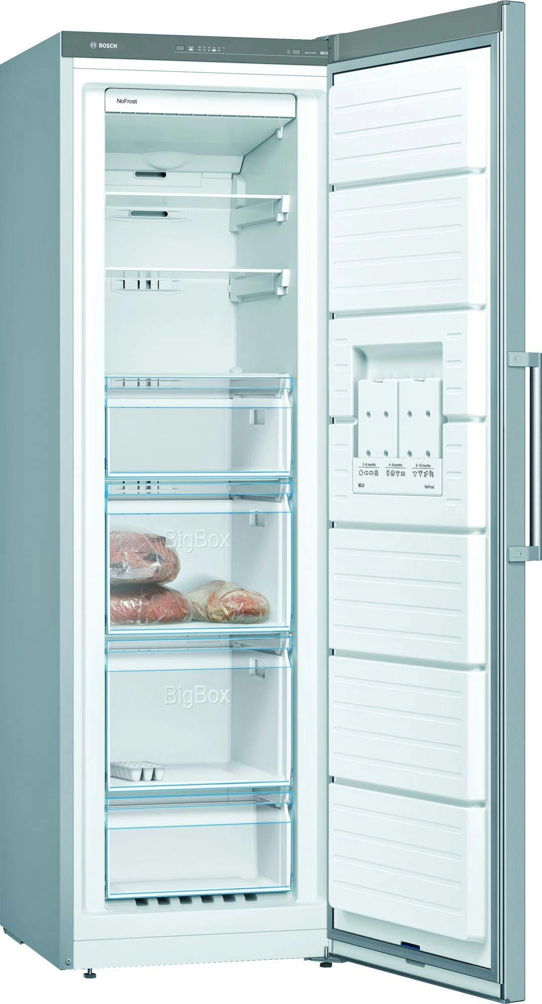 Bosch Serie 4 Serie | 4 Freistehender Gefrierschrank186 x 60 cm Edelstahl-Optik. Typ: Senkrecht. Nutzinhalt Gefrierfach: 242 l, Klimakategorie: SN-T, Gefriervermögen: 20 kg/24h, Lagerzeit bei Störung: 25 h, Geräuschpegel: 39 dB, Sternekennzeichnung: 4*, No-Frost-System. Türanschlag: Rechts. Energieeffizienzklasse: F, Jährlicher Energieverbrauch: 294 kWh. Produktfarbe: Edelstahl