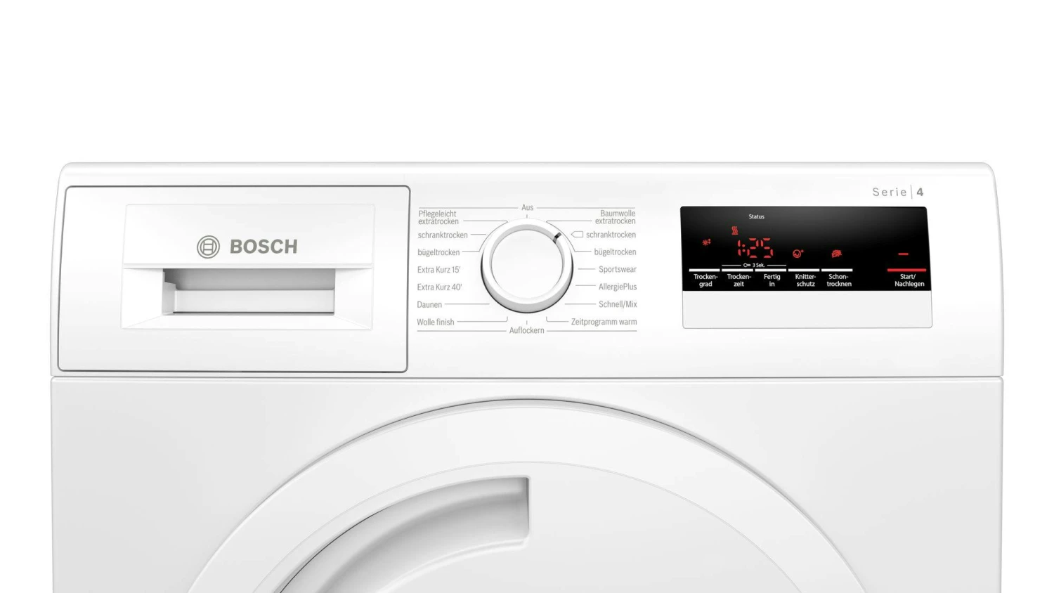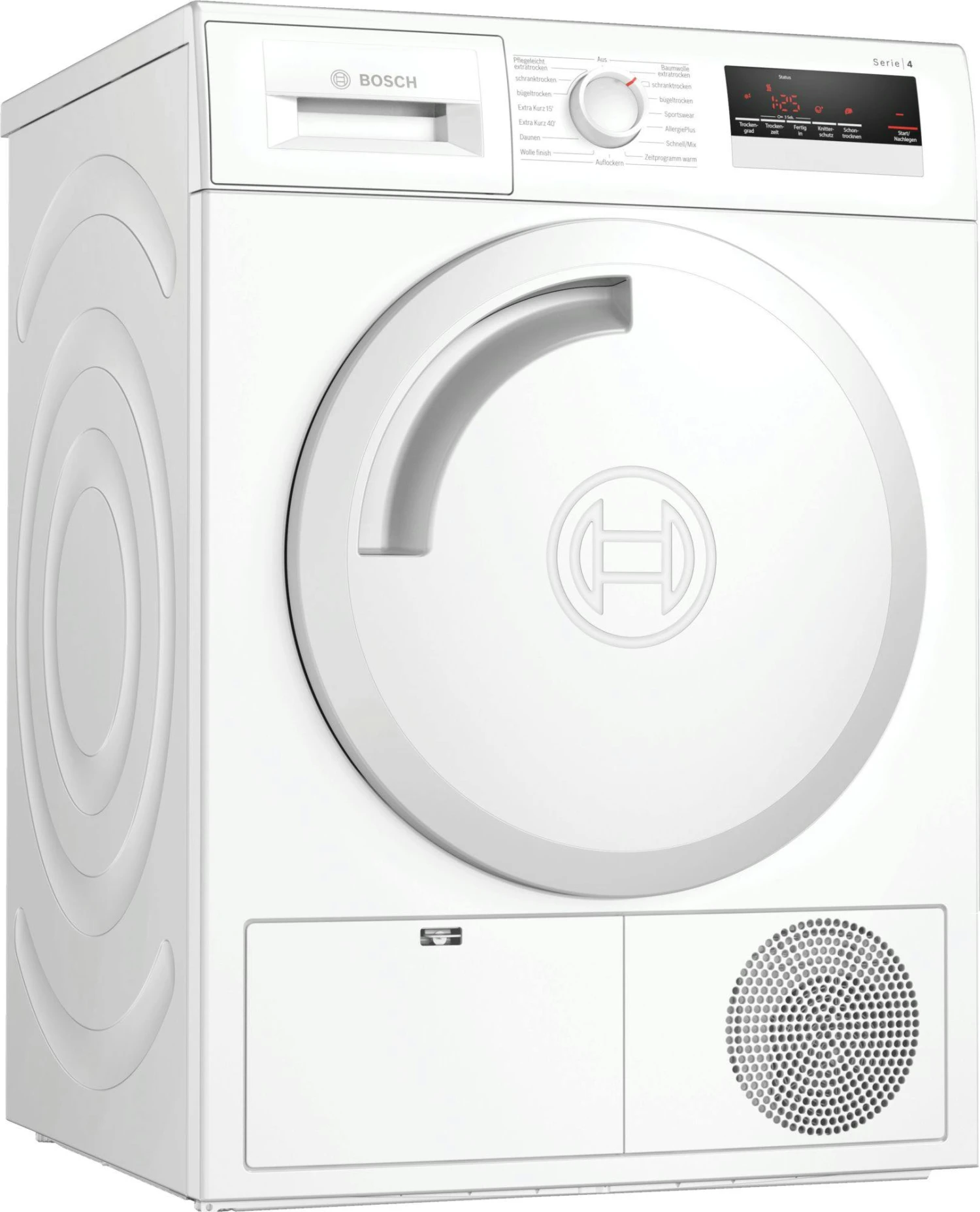 Bosch Serie 4 WTN83202. Geräteplatzierung: Freistehend, Ladetyp: Frontlader, Trocknungssystem: Kondensation. Nennkapazität: 8 kg, Trocknungsklasse: B, Trockenprogramme: Wolle, Sport, Bluse/Shirt. Einschalteverzögerung (max.): 24 h. Energieeffizienzklasse: B, Energieverbrauch: 4,63 kWh, Jährlicher Energieverbrauch: 560 kWh. Tiefe: 599 mm, Breite: 598 mm, Höhe: 842 mm