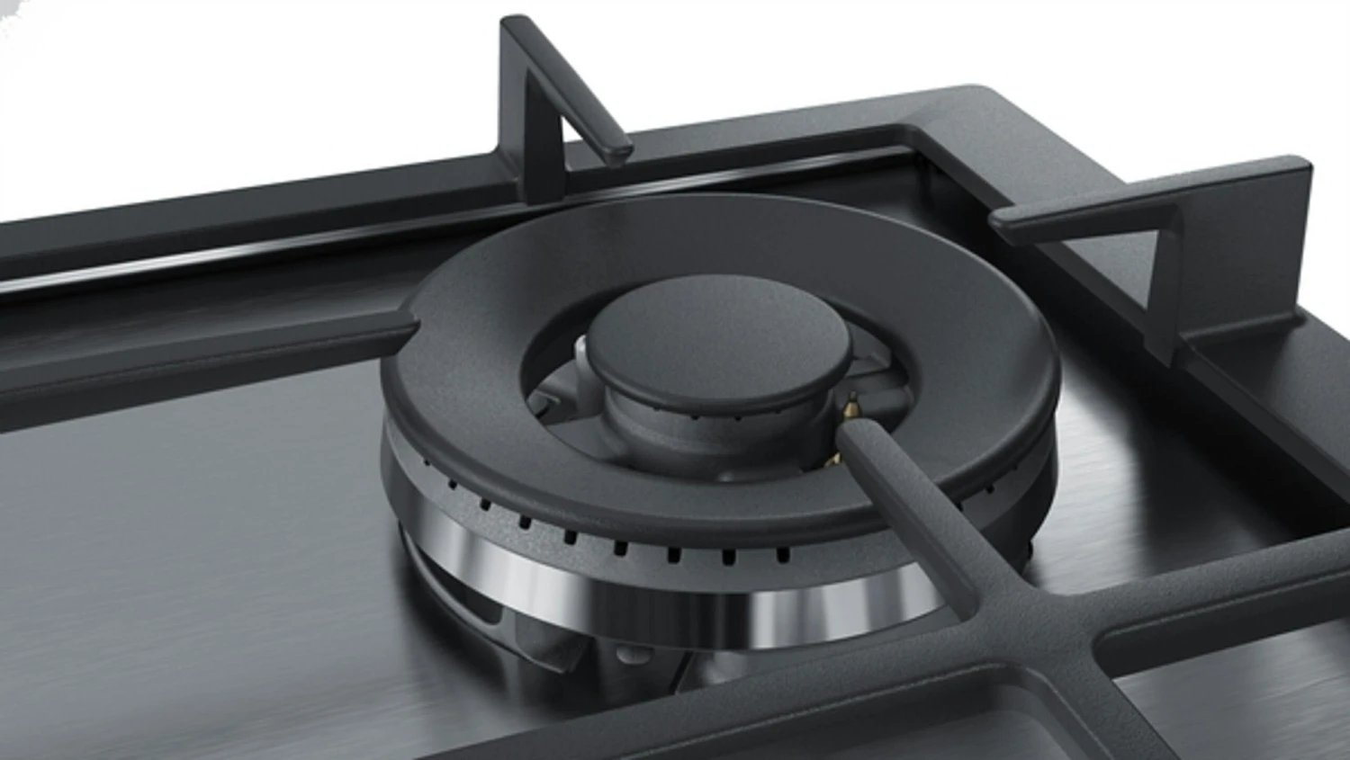 Bosch Serie 6 PCH6A5C90D. Produktfarbe: Schwarz, Edelstahl, Geräteplatzierung: Integriert, Kochfeldtyp: Gaskochfeld. Steuerung: Drehregler, Steuerungsposition: Vorne oben. Anschlusswert (elektrisch): 1 W, Anschlusswert (Gas): 8000 W, AC Eingangsspannung: 220-240 V. Breite: 582 mm, Tiefe: 520 mm, Höhe: 45 mm