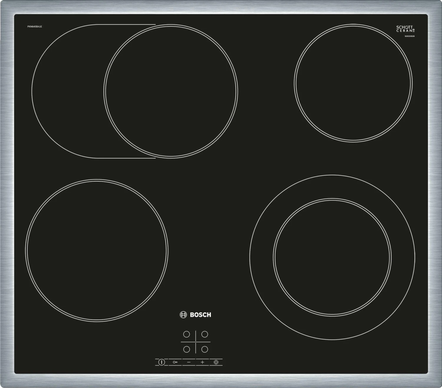 Bosch Serie 6 PKC845FP1D. Produktfarbe: Schwarz, Geräteplatzierung: Integriert, Kochfeldtyp: Keramik. Zertifizierung: CE, VDE. Steuerung: Berührung, Uhrtyp: Elektronisch. Anschlusswert (elektrisch): 9300 W, AC Eingangsspannung: 220-240 V, AC Eingangsfrequenz: 50 – 60 Hz. Breite: 795 mm, Tiefe: 517 mm, Höhe: 48 mm