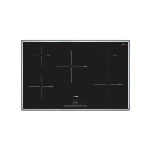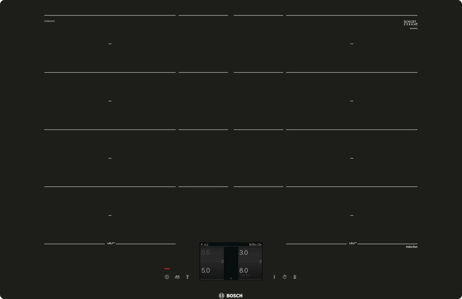 Bosch Serie 8 PXV901DV1E. Produktfarbe: Schwarz, Geräteplatzierung: Integriert, Kochfeldtyp: Zonen-Induktionskochfeld. Schmorplatte/ Kochzone: 2200 W, Standard Herdplatte/Kochzone: 2600 W, Große Herdplatte/Kochzone: 3300 W. Steuerung: Berührung, Steuerungsposition: Vorne oben, Timer-Typ: Digital. Anschlusswert (elektrisch): 11100 W, AC Eingangsspannung: 220-240 V, AC Eingangsfrequenz: 50 – 60 Hz. Breite: 892 mm, Tiefe: 512 mm, Höhe: 56 mm